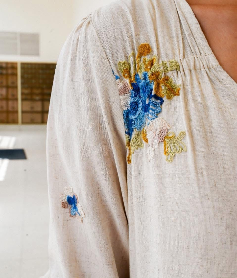 Beige Knee Length Dress With Blue Embroidery Flowers